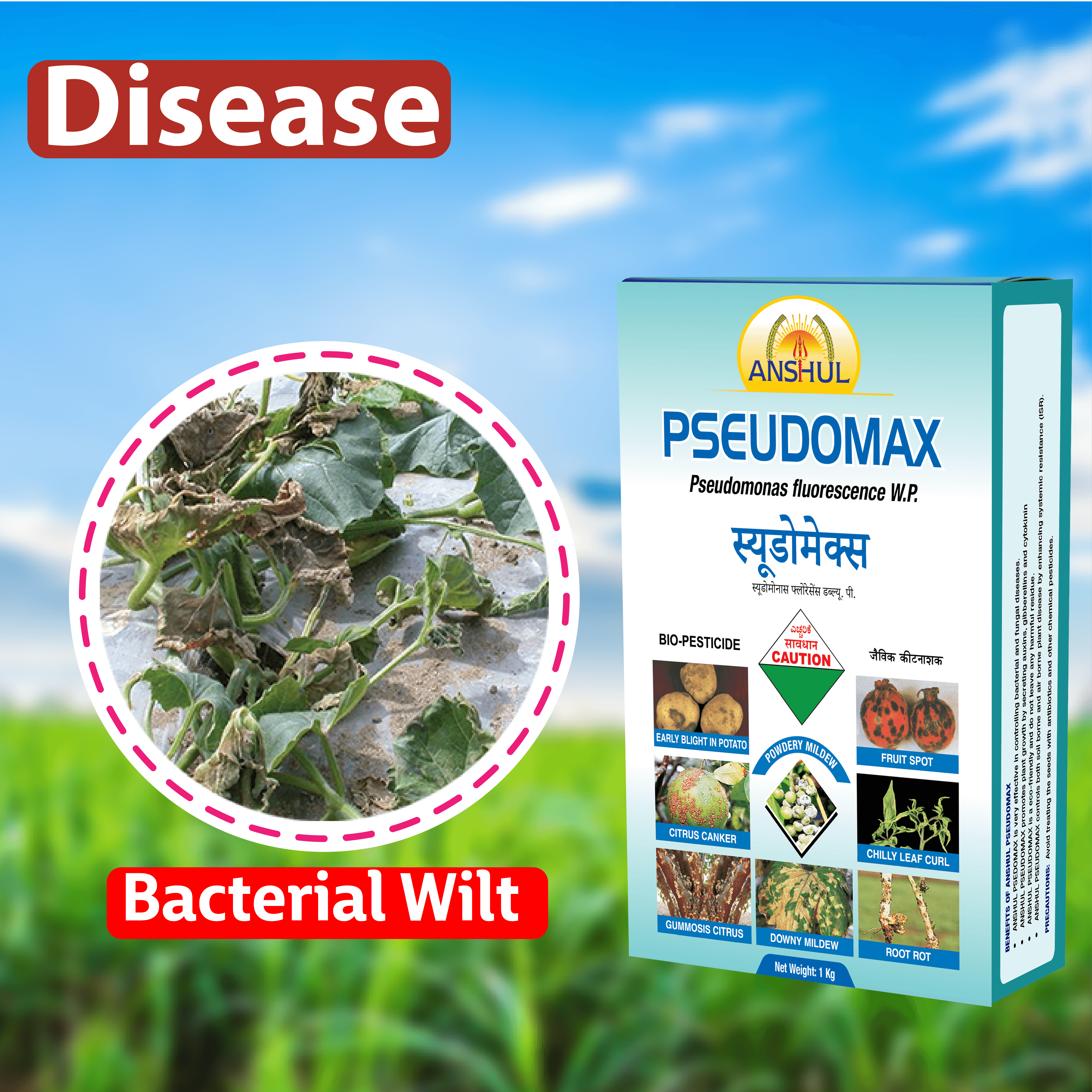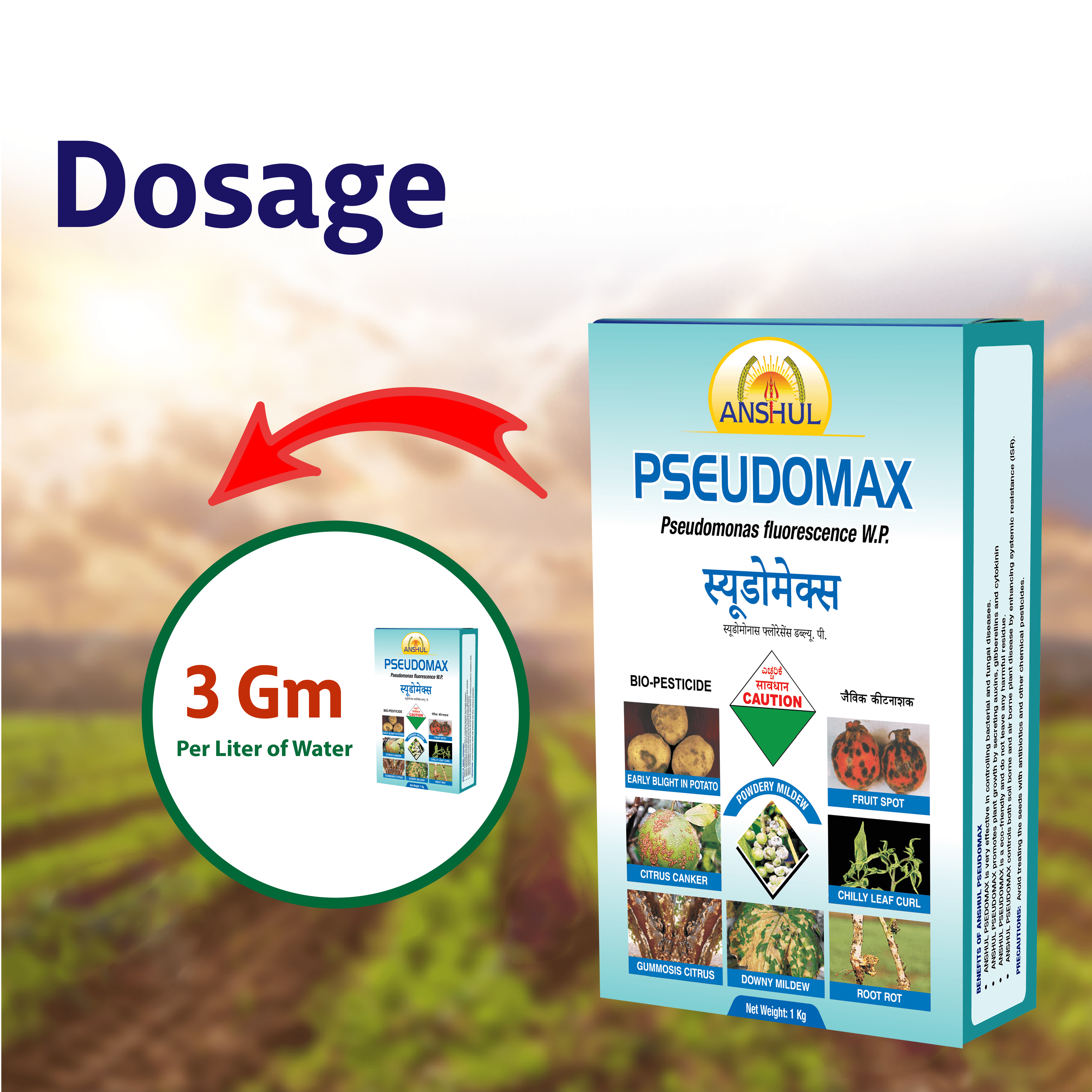 Dosage: Dissolve 3gm of Anshul Pseudomax in one litre of water and spray on both surface of the leaves/ Mix 2kg of Anshul Pseudomax in 100 kg of FYM or Anshul Compact and broadcast in one acre.