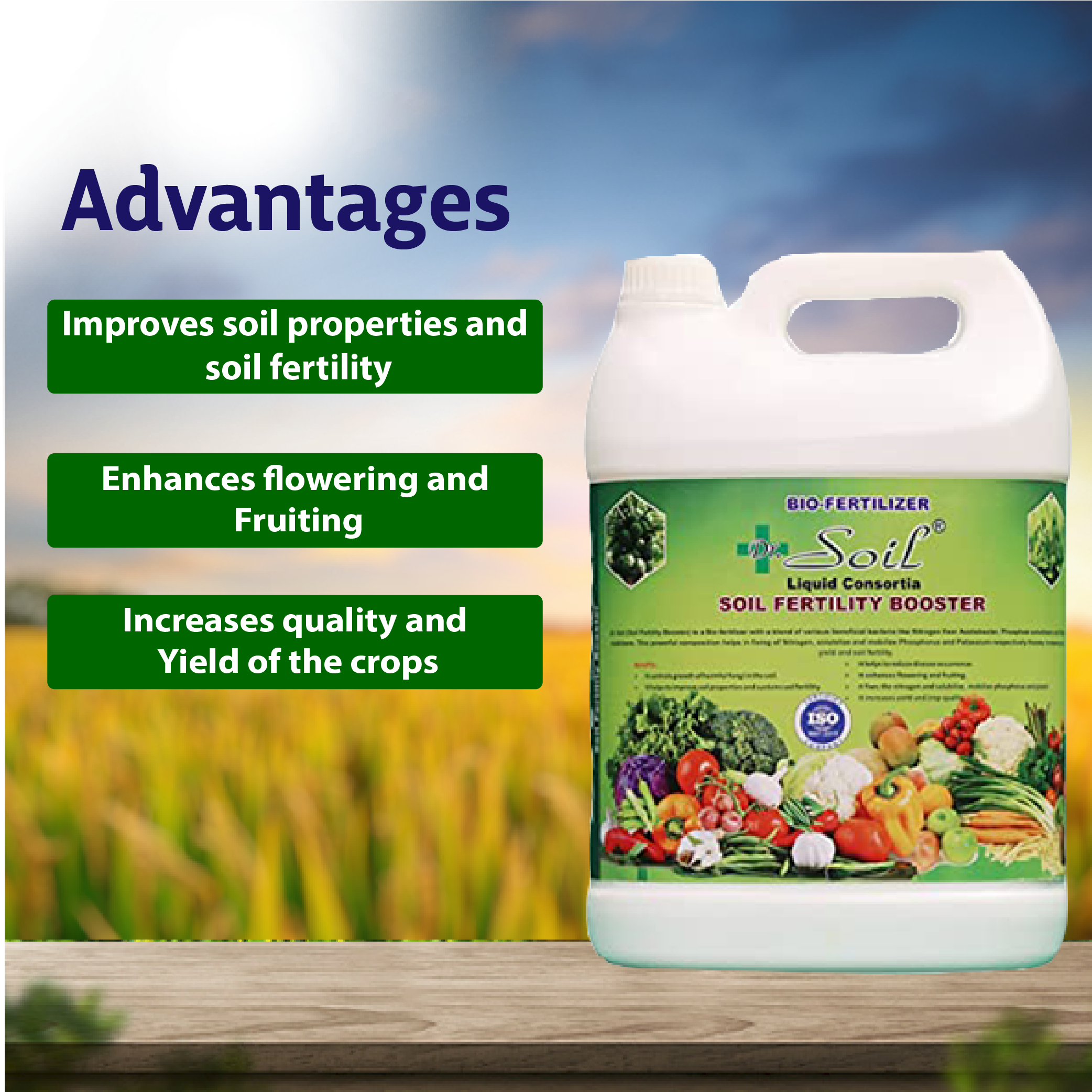 Dr. Soil (Soil Fertility Booster) is a Bio-fertilizer with a blend of various beneficial bacteria like Nitrogen fixers (Azotobacter and Azospirillium) Phosphate Solubilizers and Potash Mobilizers. This powerful composition helps in fixing of Nitrogen solubilize and mobilize Phosphorus and Potassium respectively thereby increasing crop yield and soil fertility.