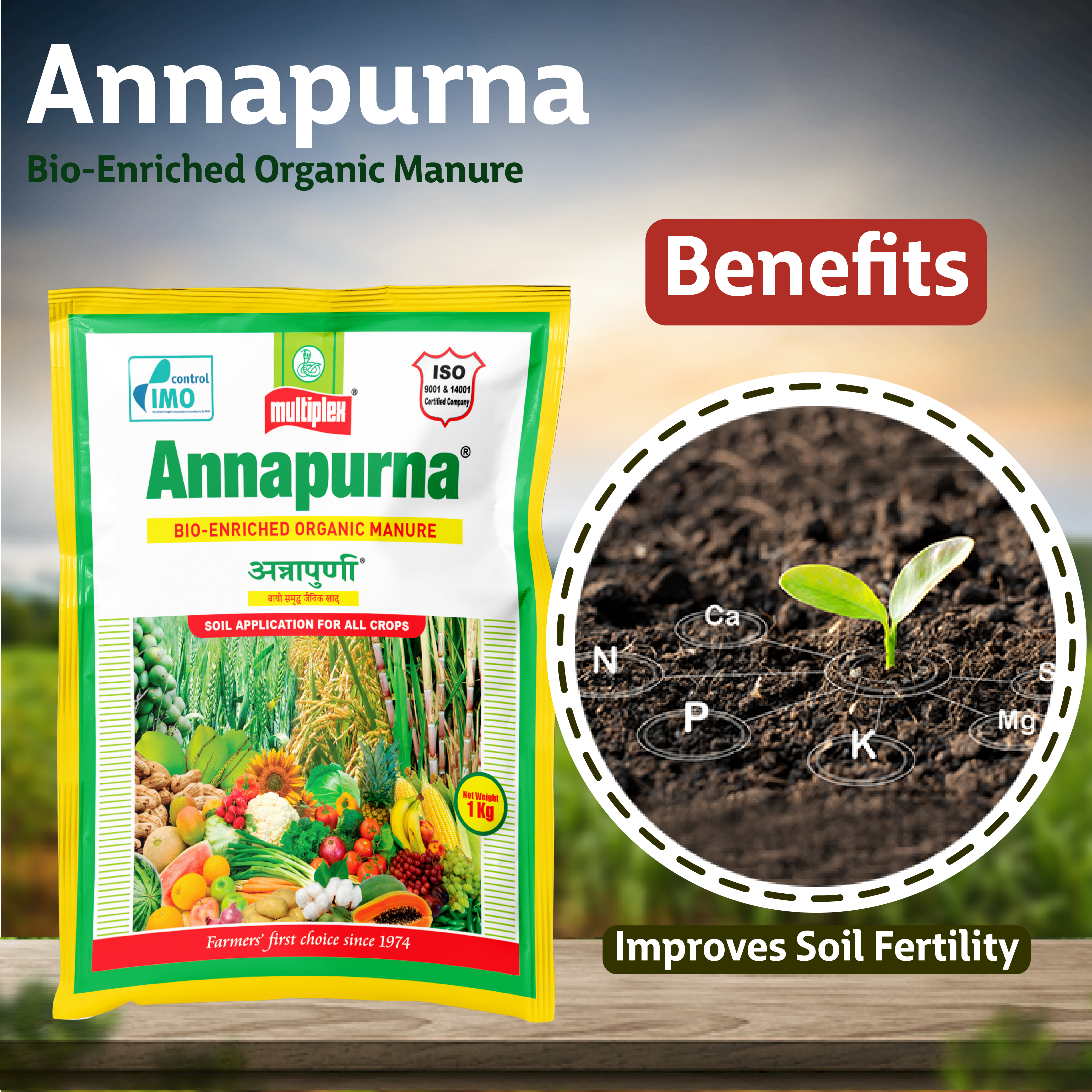 Product DescriptionMultiplex Annapurna improves soil structure & soil fertility. It helps for better root proliferation; minimizes the use of chemical fertilizers. It controls many soil-borne pests & diseases. Annapurna is a well-decomposed coco peat-based organic manure fortified with neem cake, castor cake, Pongamia cake, vermicompost.