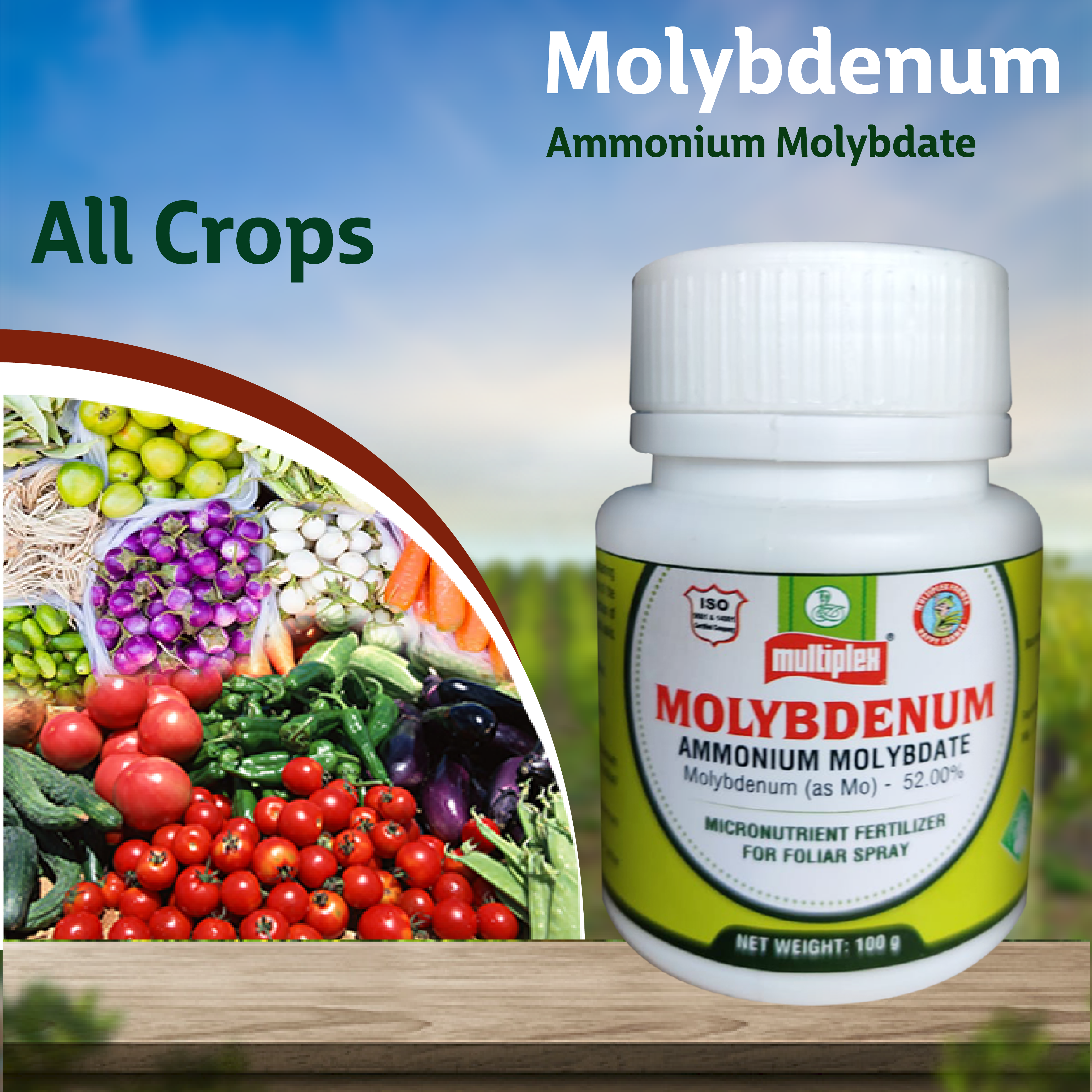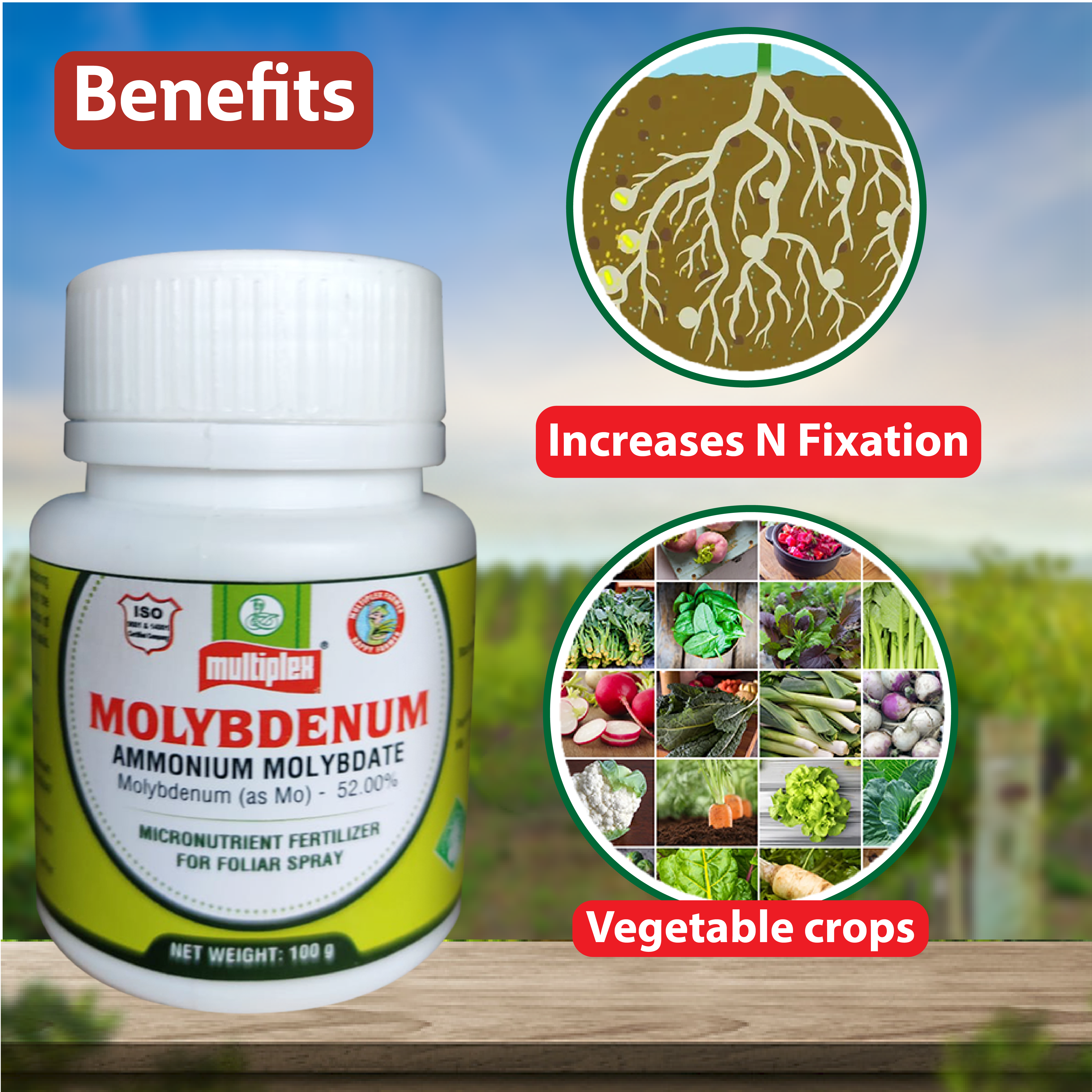 Product Description: Multiplex Molybdenum Contains , Molybdenum 52% in form of Ammonium Molybdate. Molybdenum increases Nitrogen fixation, enhances absorption of other nutrients from the soil for Plants .Seed treatment with molybdenum is beneficial for all types of leguminous plants / vegetables. Early applications of Molybdenum to cucumber, water melon etc., increases yield.