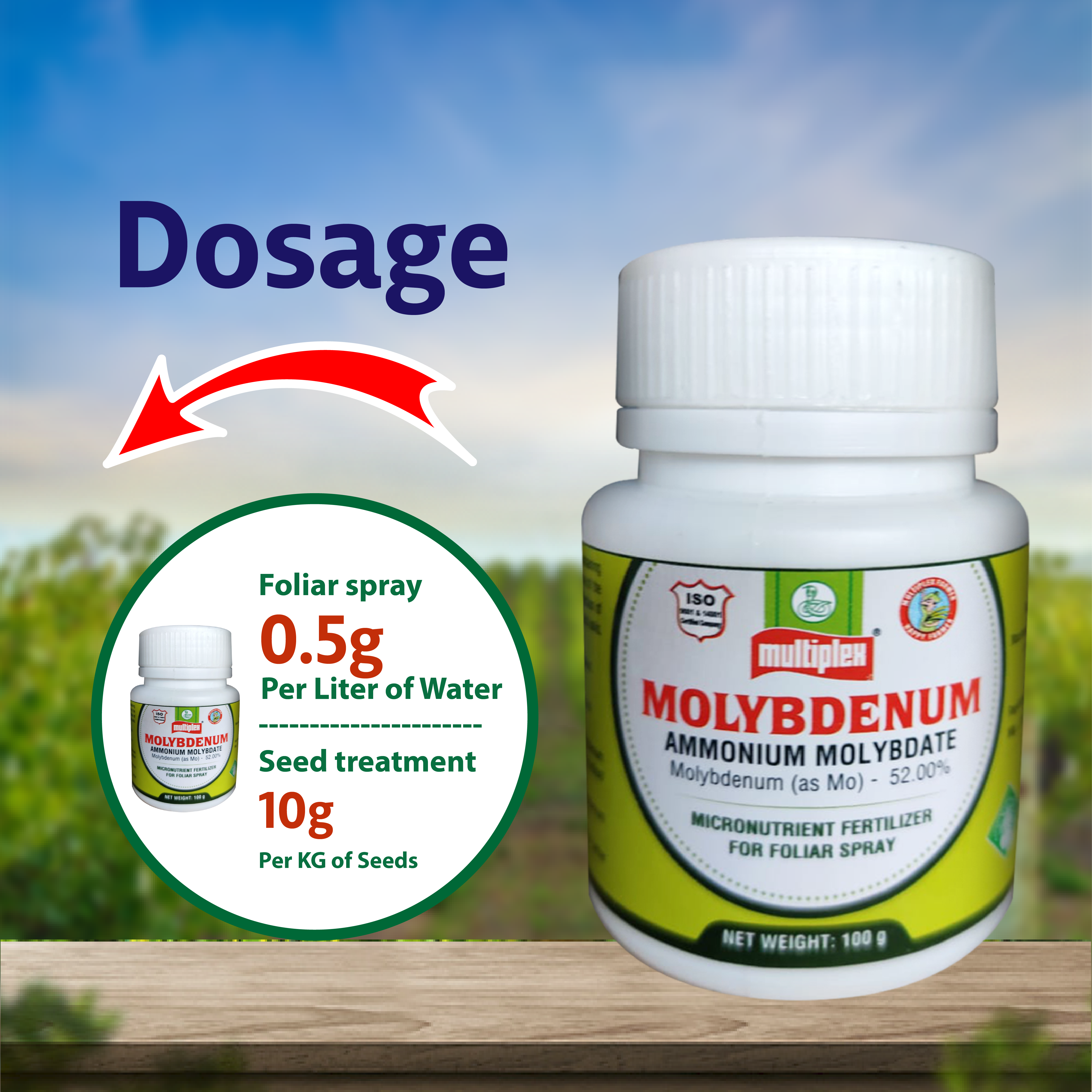Foliar Spray: Dissolve Multiplex Molybdenum 0.5 g in one liter of water and spray on leaves liberally 30 days after germination / transplantation.