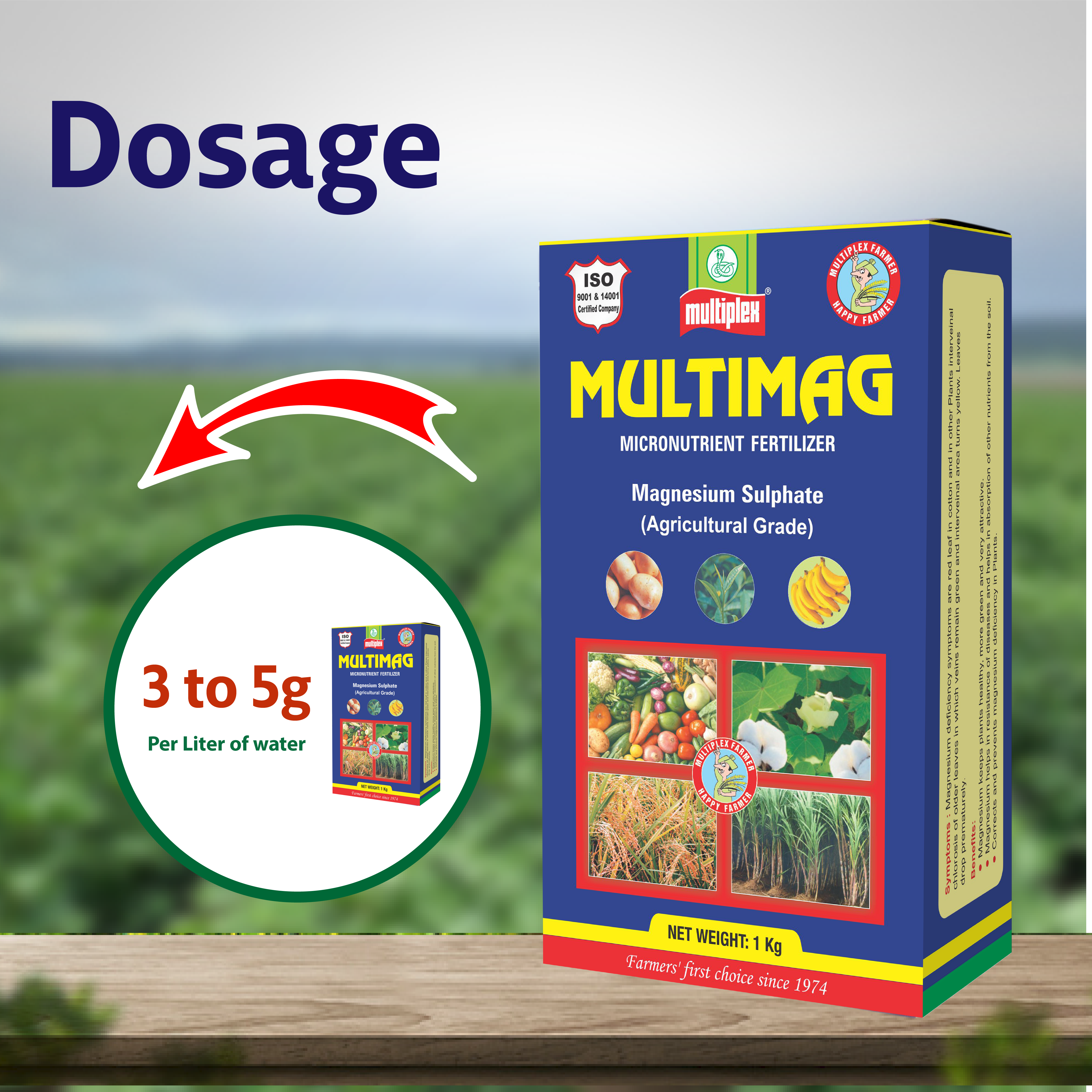 Dosage: Foliar application - Use Multiplex Multimag 3 to 5 g per liter of water, Soil Application - 20 to 25 Kg per acre, Plantation crops - 150-200 g per tree per palm.
