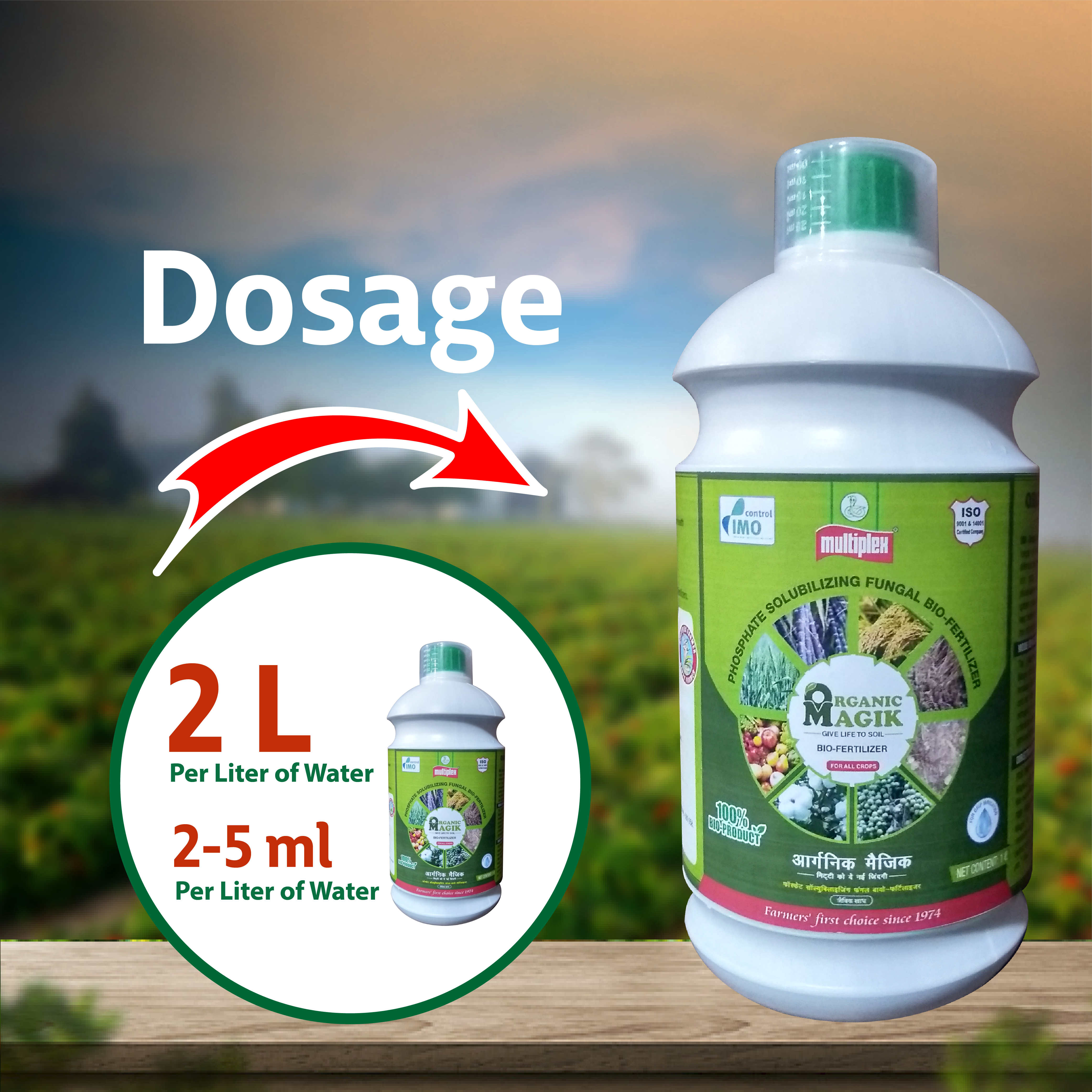 Dosage: For liquid based: 2 litres / acre, Aqueous suspension - Drip irrigation at the rate of 1 to 2 litres per acre by diluting in 400 liters of water. For long duration crops, application can be repeated at 60 days interval. Foliar Application - Apply at the rate of 2 to 5 ml per Lt of water, 2 to 3 sprays at 15 days intervals.