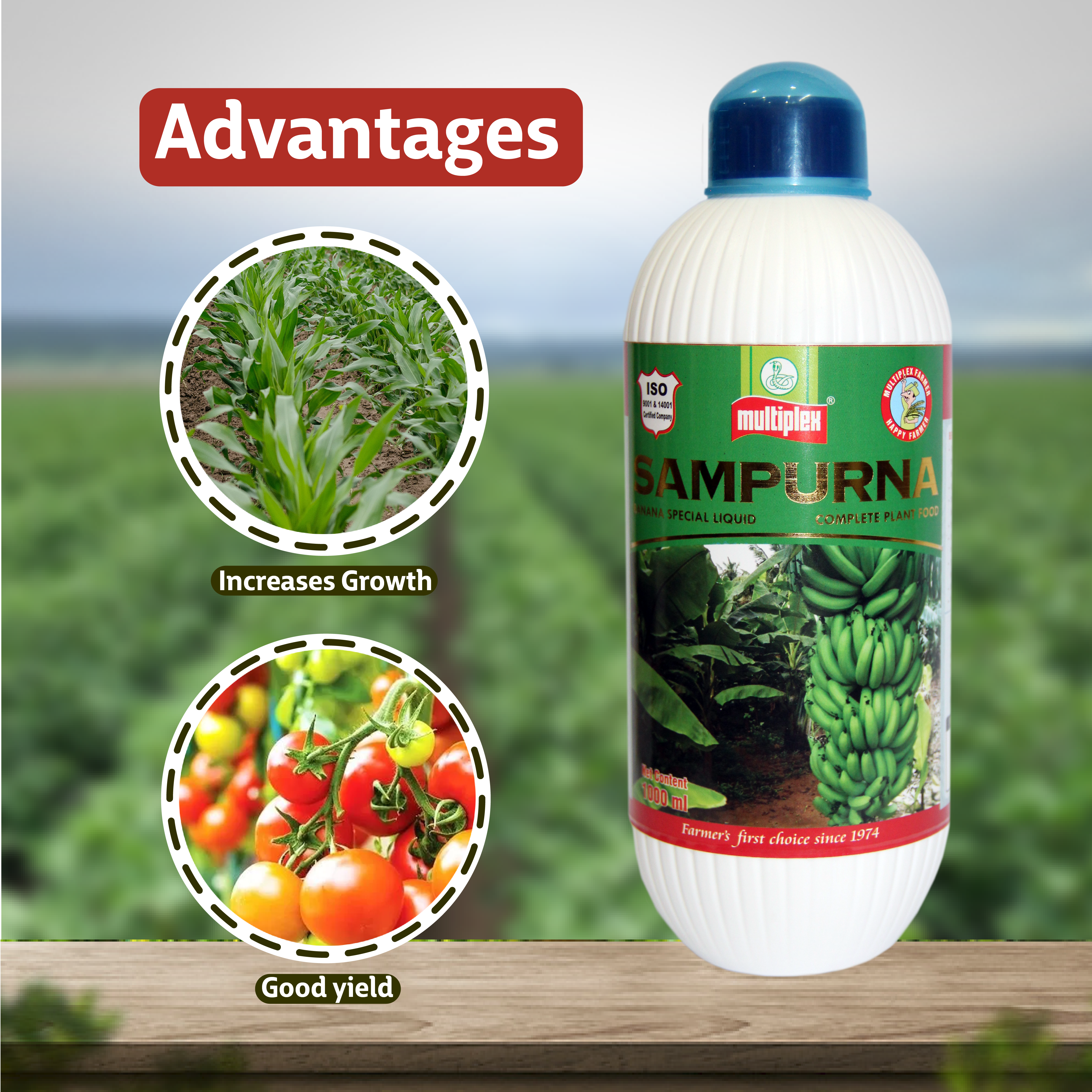 Product Description: Multiplex Sampurna contains all essential plant nutrients like major nutrients – N, P, K; secondary nutrients–Ca, Mg, S, and micronutrients like Zinc, Manganese, Iron, Copper, Boron & Molybdenum. It contains a high quantity of magnesium & potassium and it is ideally suitable for Banana crops.