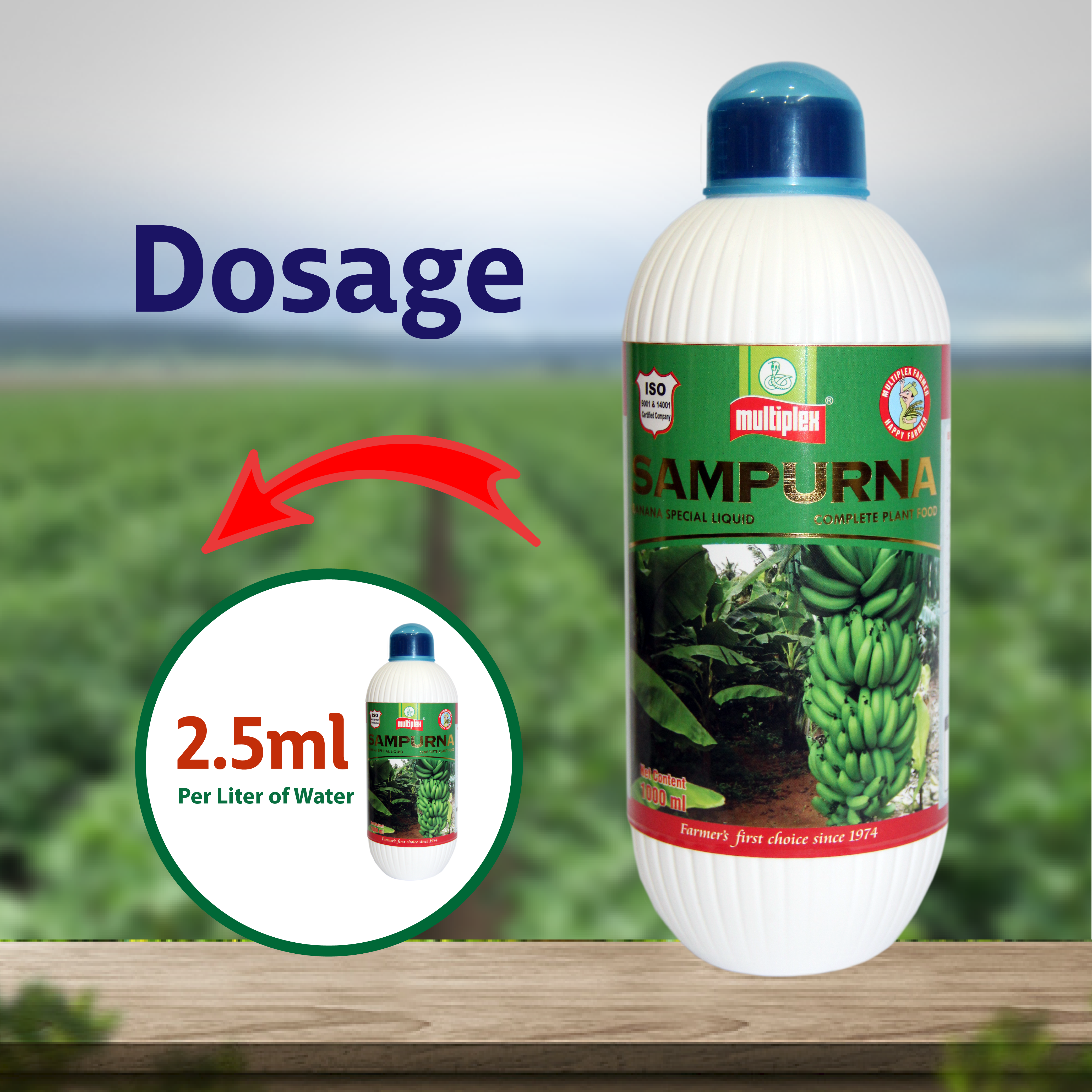 Dosage: Dissolve 2.5 ml of Multiplex Sampurna in one liter of water and spray on both surfaces of leaves.4–to 5 sprays are recommended for the banana crop. First, spray 45–50 days after transplantation. Second spray: 40 – 45 days after the first spray. The third spray: should be given as cone treatment (250 ml of solution per plant: 2.5 ml of Multiplex Sampurna /liter of water) 40 – 45 days after the second spray. Fourth spray: after 20 – 25 days of bunch initiation and Fifth spray after removing flower head.