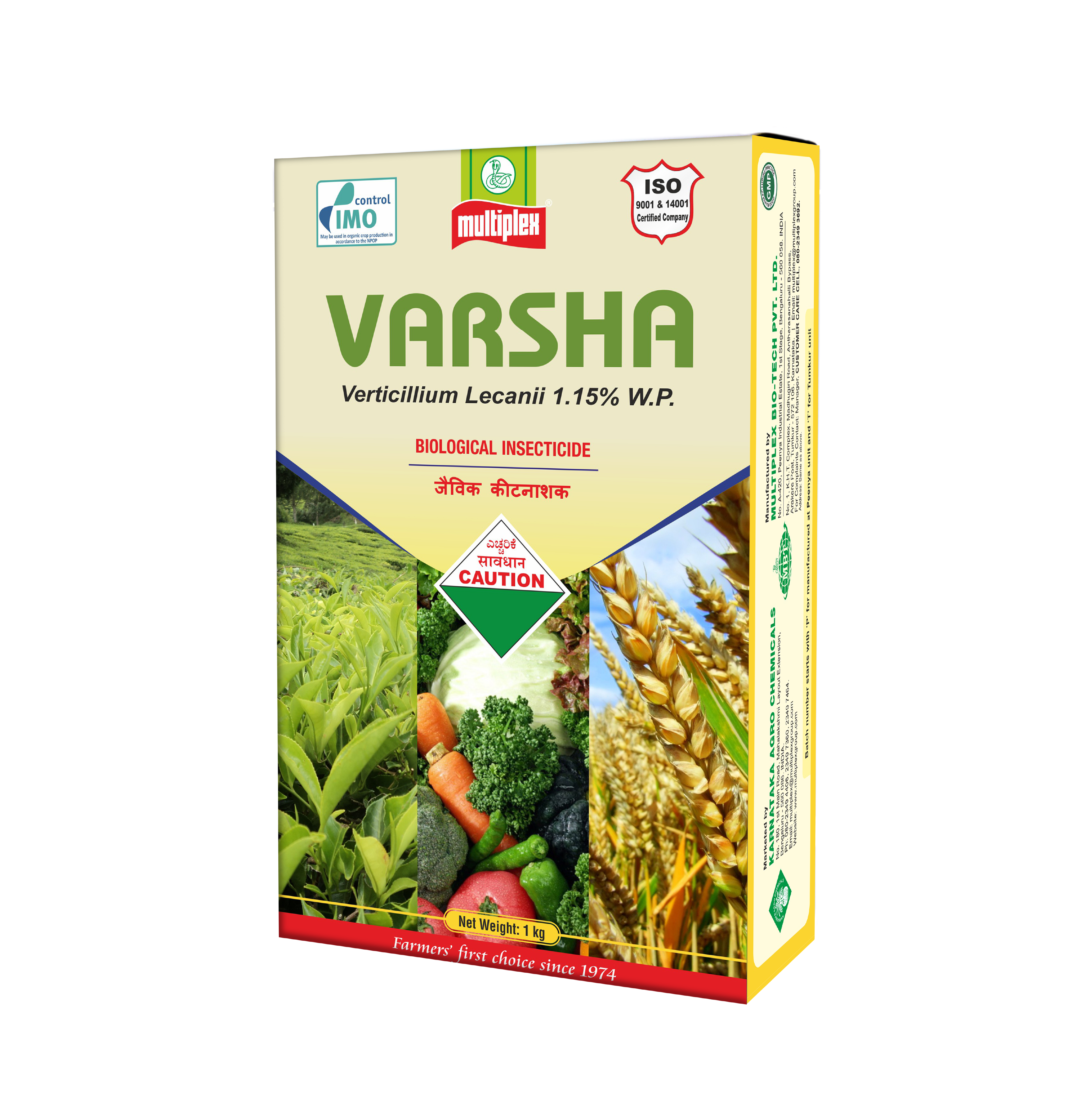 Product description: MULTIPLEX VARSHA is a bio pesticide which contains Verticillium lecanii in powder form. Vasrsha eventually grows out through the cuticle & sporulates on the outside of the body. Infected insects appear as white to yellowish cottony particles. The fungal mycelium of Verticillium lecanii produces a cyclodepsipeptide toxin called bassianolida & other insecticidal toxin dipilolinic acid, which kills the insects in 4 to 6 days.