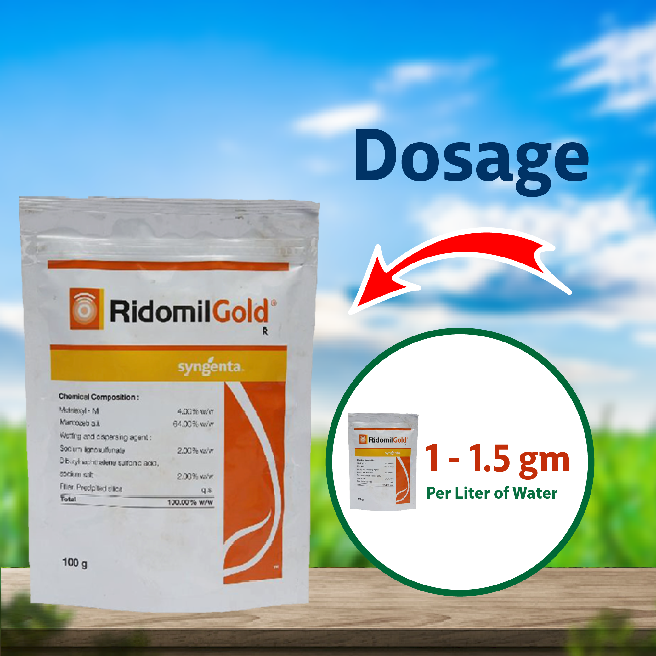 • DOSAGE : Dissolve Ridomil Gold 1-1.5 gm/ liter of water and spray on the leaves